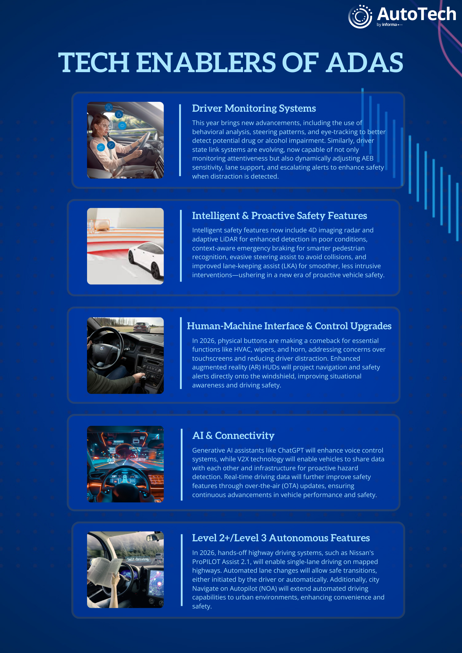 Advanced Driver Assistance Systems (ADAS) continue to evolve, powered by cutting-edge technologies that enhance safety, comfort, and driving precision. In 2026, key enablers like 4D imaging radar, adaptive LiDAR, AI-driven decision-making, and context-aware systems are redefining the driving experience, paving the way for smarter, more intuitive, and proactive vehicle capabilities.